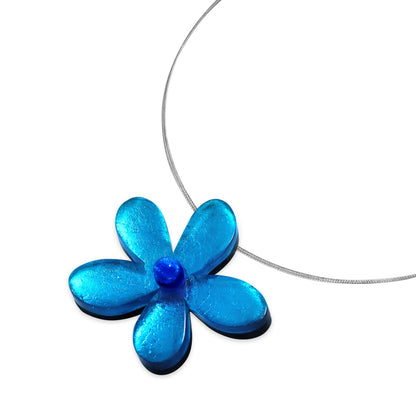 This pendant is hand made from resin using silverleaf to give the colour vibrancy and features a raised contrasting resin cabochon in the centre of the flower.
